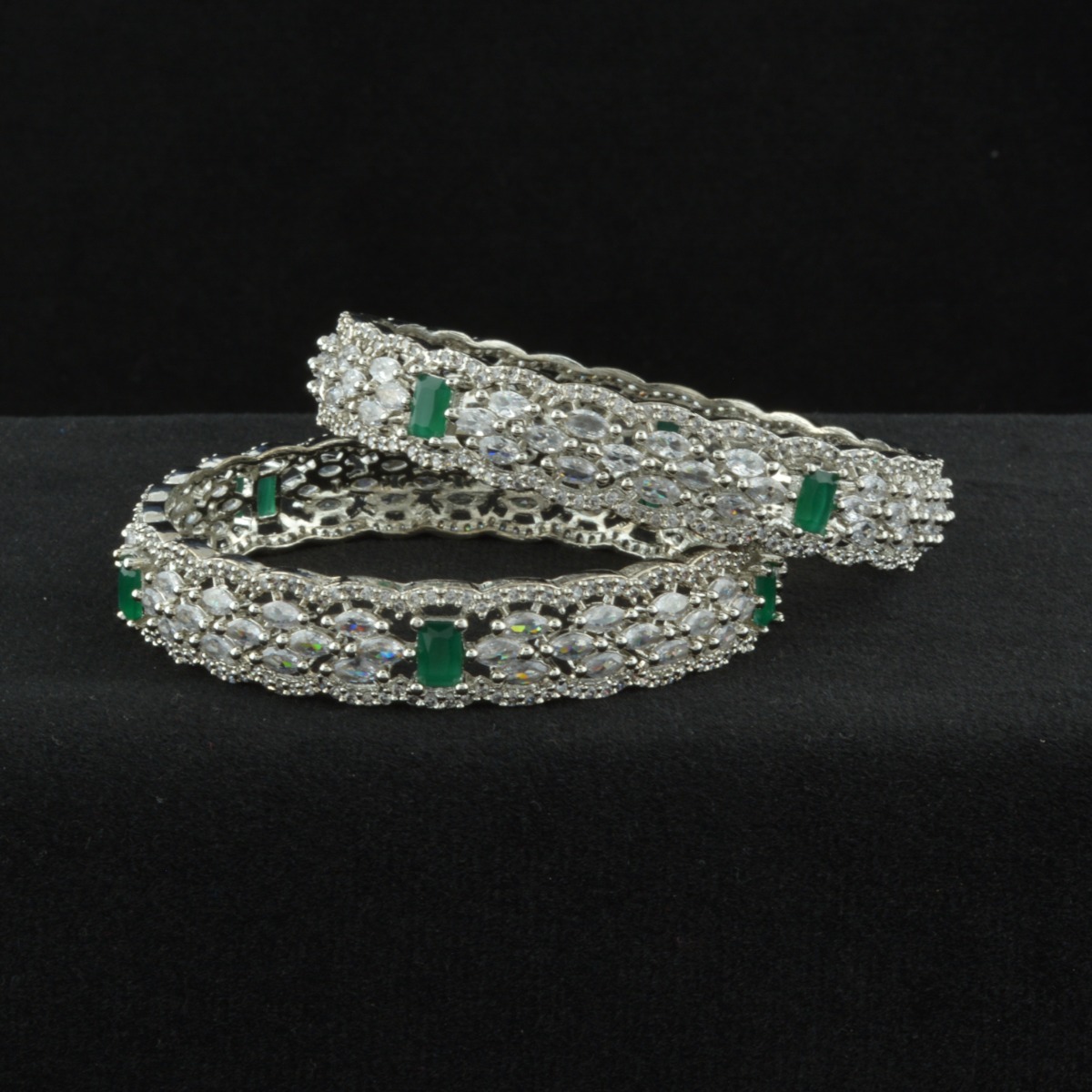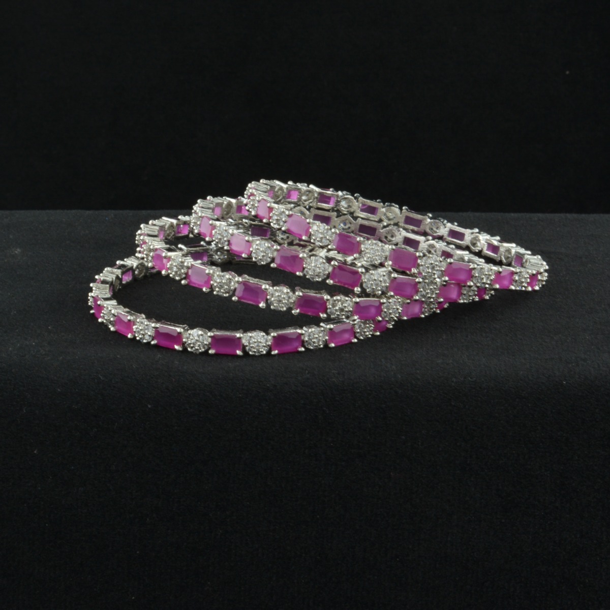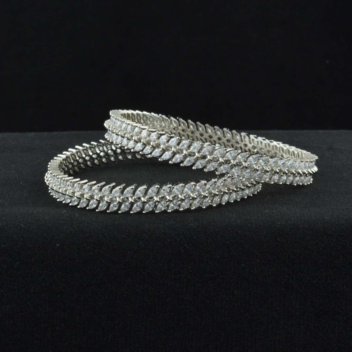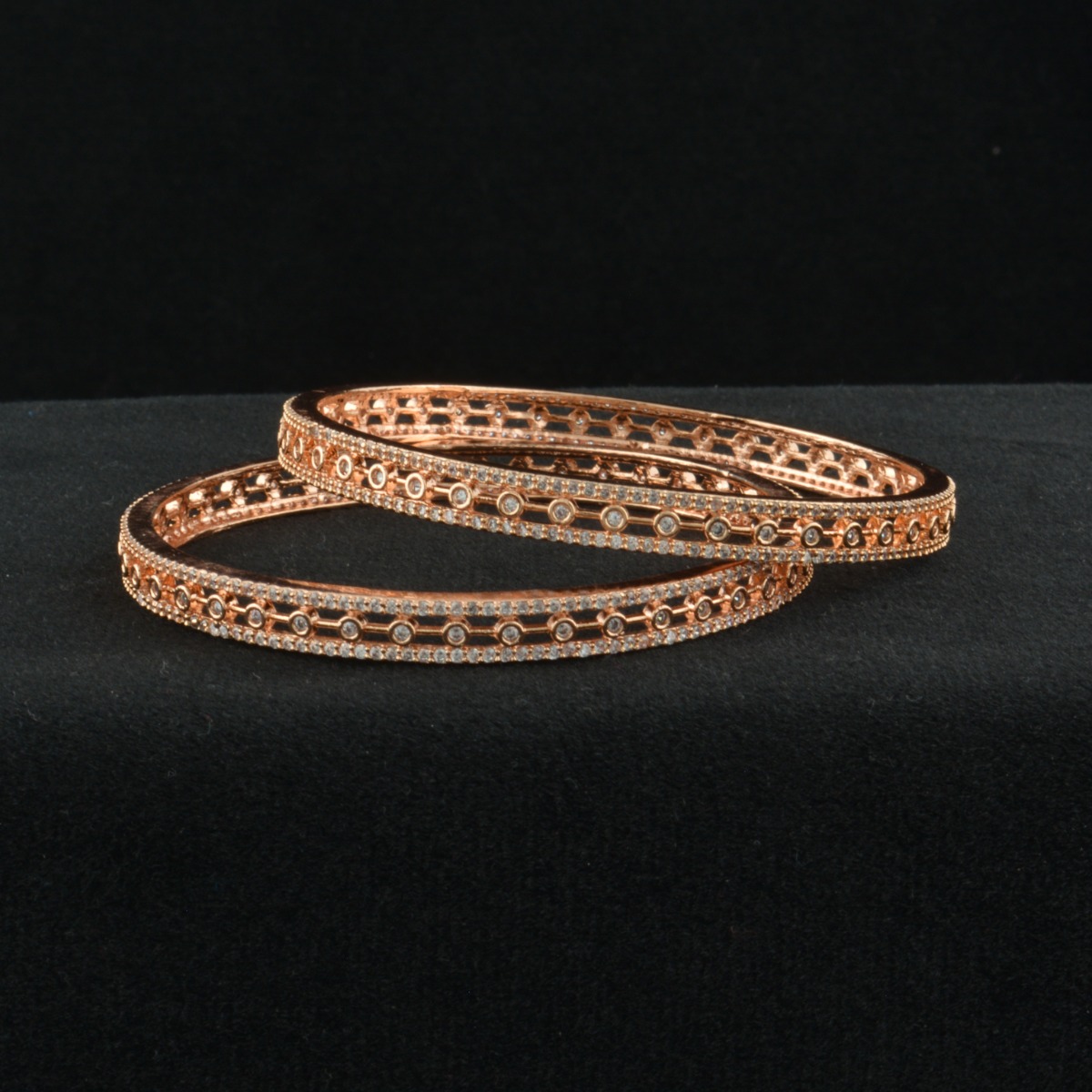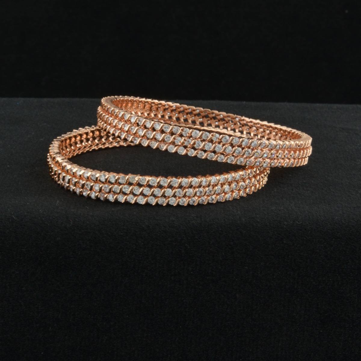 Enhance your festive elegance with these exquisite CZ American Diamond Bangles crafted in an exclusive designer pattern. Adorned with sparkling white stones and finished in luxurious rose gold plating, they offer a perfect blend of brilliance and warmth. Designed without chabi for a smooth, seamless look, these bangles provide comfortable and secure wear. Ideal for gifting, special occasions, and festival celebrations, they complement all regional styles beautifully. Pair them effortlessly with sarees to create a graceful and refined statement. A timeless accessory that combines modern sparkle with classic charm, adding sophistication and radiant beauty to every ensemble.