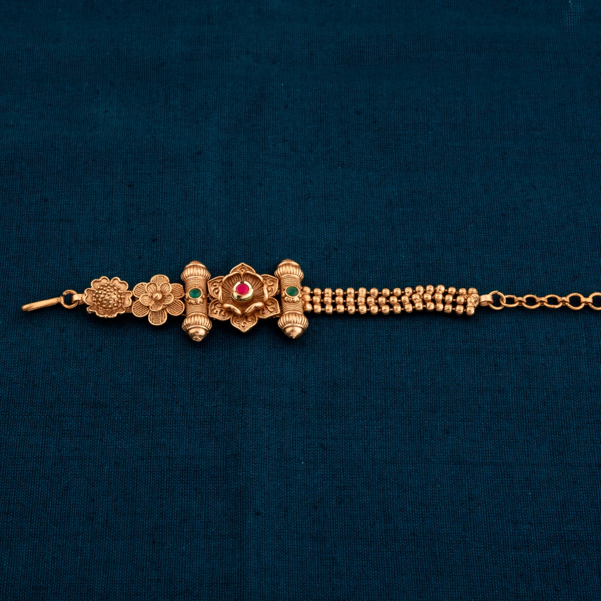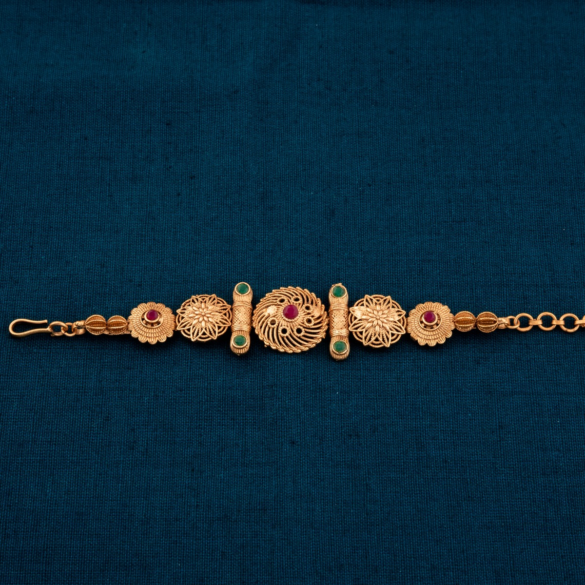 Add a touch of timeless elegance to your ethnic ensemble with this antique-style bracelet for women, featuring an exclusive and intricate design. Adorned in vibrant ruby and green tones and finished with a luxurious antique polish, it radiates traditional charm and sophistication. Designed with chabi, it offers a secure and comfortable fit while making a bold statement. Perfect for weddings, traditional events, festive celebrations, and special occasions, this bracelet complements sarees and Indian kurtis beautifully. Lightweight yet striking, it reflects heritage-inspired craftsmanship and refined style, making it an essential accessory for women who cherish classic elegance with a cultural touch.