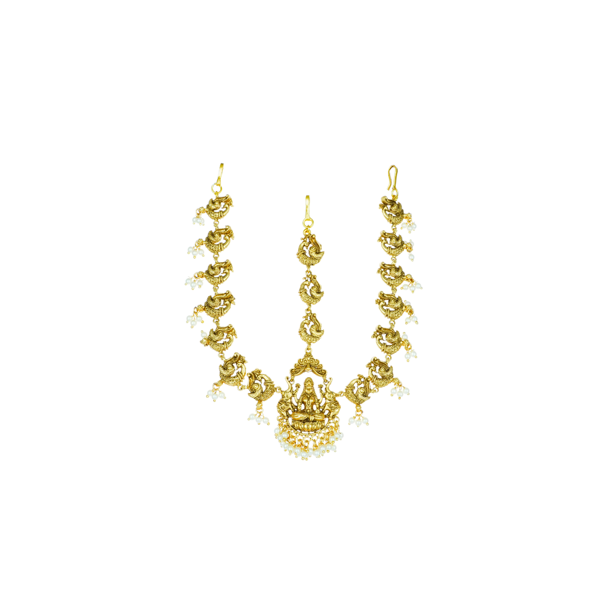 This is the perfect tayra tika for all women and girls who like designer hair accessories. This traditional temple forehead tikka can be matched with all ethnic attires like sarees, lehngas and more. This religious design has been inspired from Bollywood trends. It has a stunning Goddess Laxmi motif at its centre with a well-crafted peacock on top of it. The bright ruby and green stones add to its allure and charm while the beads hanging off its bottom give it a traditional and impressive look. This temple tika has a hook closure system.