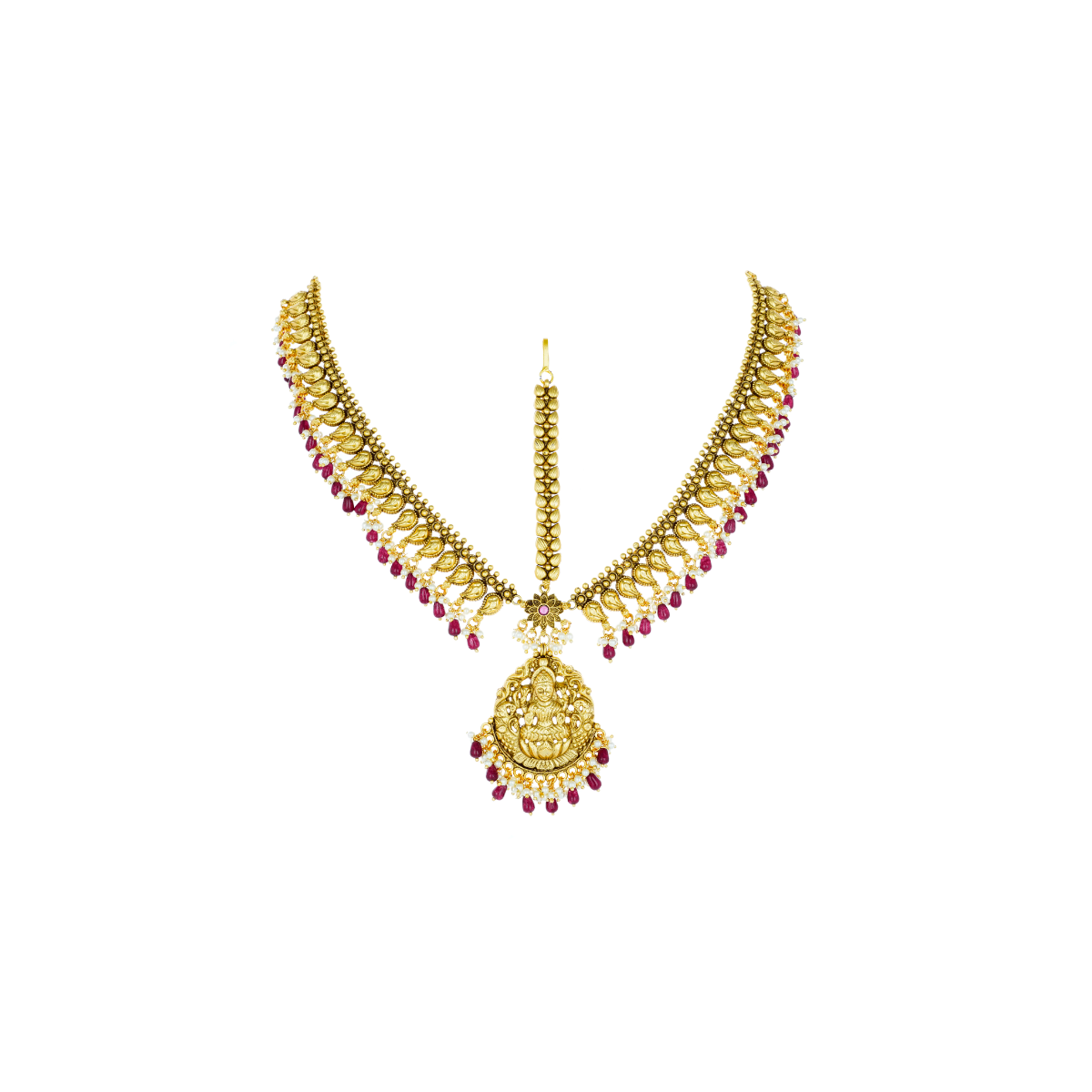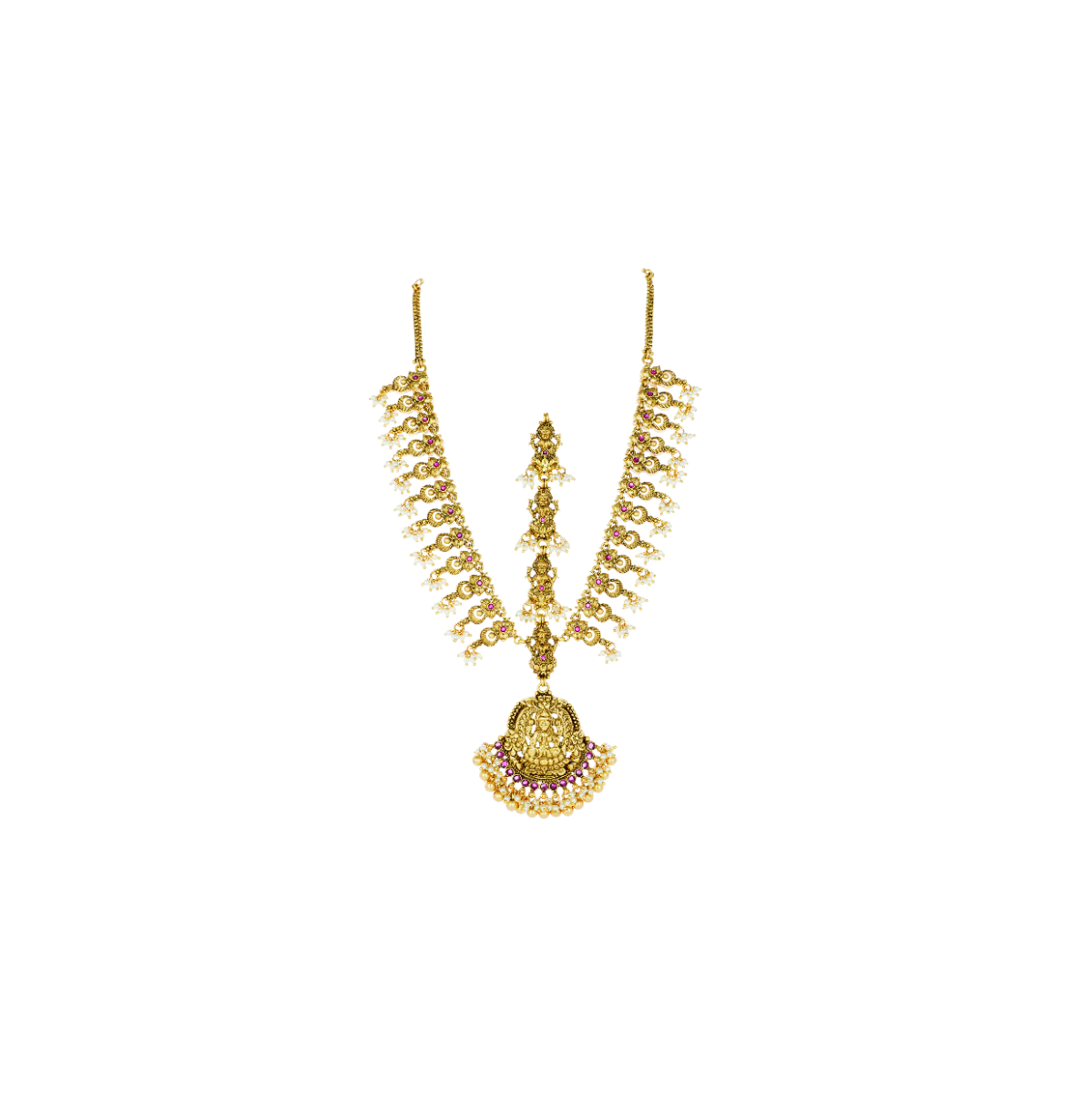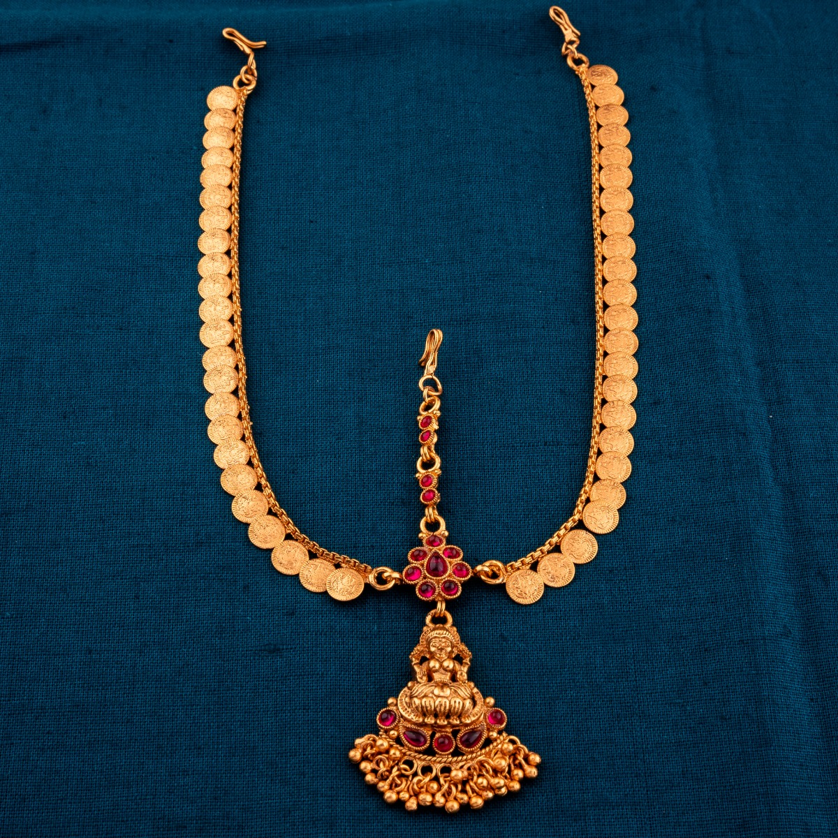 Gold-plated tayra tika with ruby and green stone embellishments. It has beautiful detailing with a Goddess Laxmi motif. It has golden bead hangings throughout its border that give it a depth and a traditional charm. Pair this religious design with sarees to amp your wedding ensemble. The design for this headband has been inspired from ancient South Indian jewels. It has a hook closure and an intricately detailed design with a dull finish that will add elegance to your look. If you like subtle yet beautiful Indian jewellery, then this tayra tika will be the perfect choice for you.