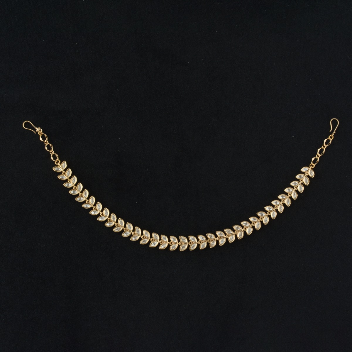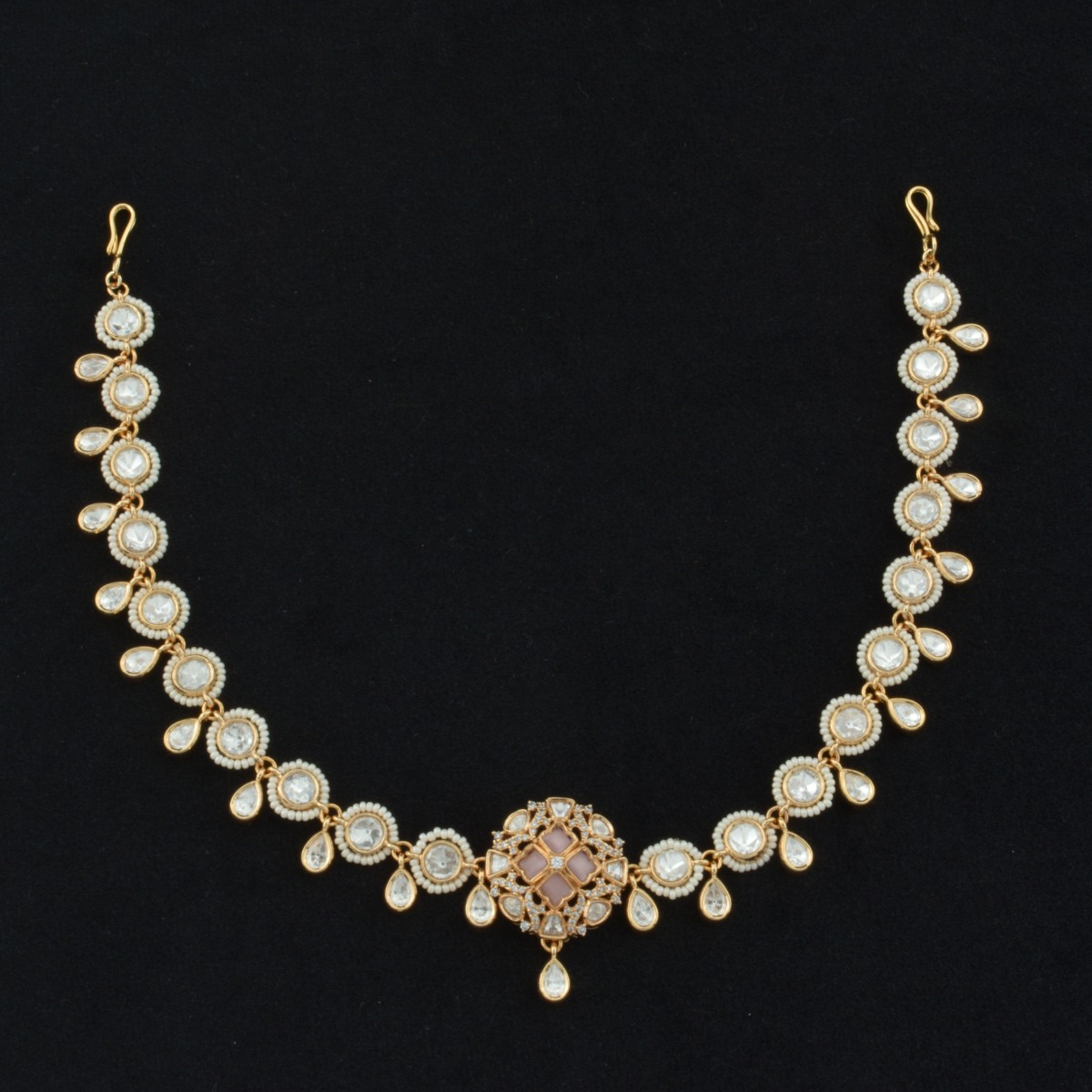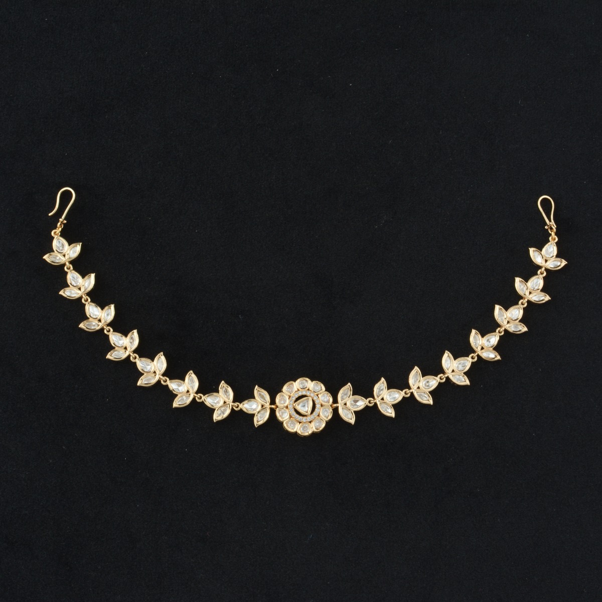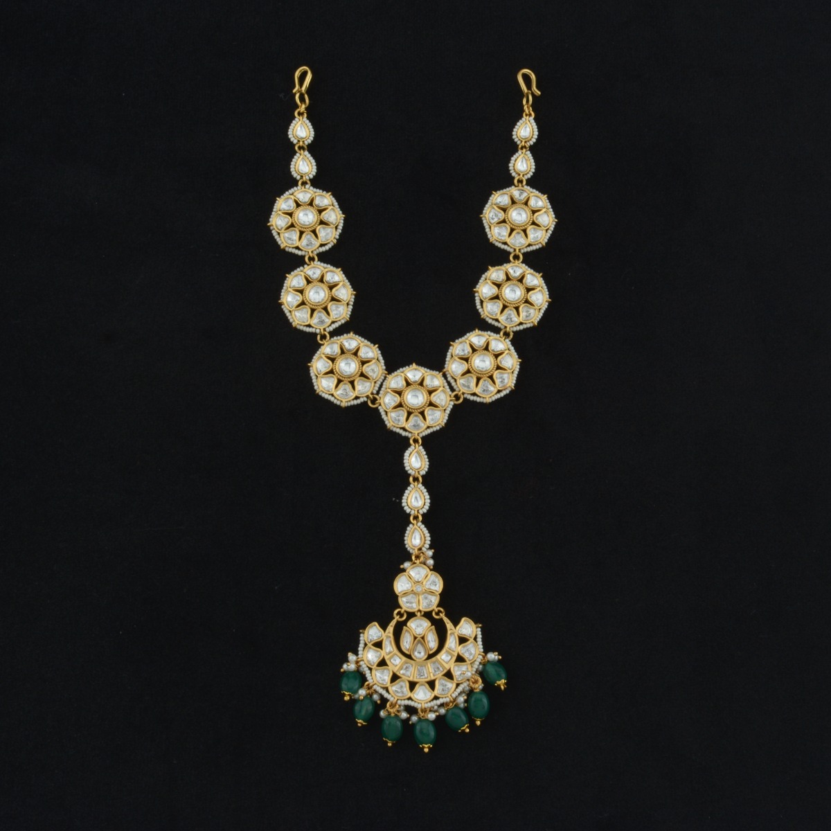 Beautiful Kundan tayra tikka with a pearl border and shish fulls. This is a gold-plated tayra tikka in a modern design that can be worn with lehengas of all colours. Wear it for any occasion to shine like a diamond at the next event. It is best suited with pearl earrings and a choker for the ultimate trendy look. Store it in a box or pouch to retain its shine and clean it with a cloth after using it to maintain it for many years. The classic combination of pearl and kundan will add charm and elegance to your ensemble.