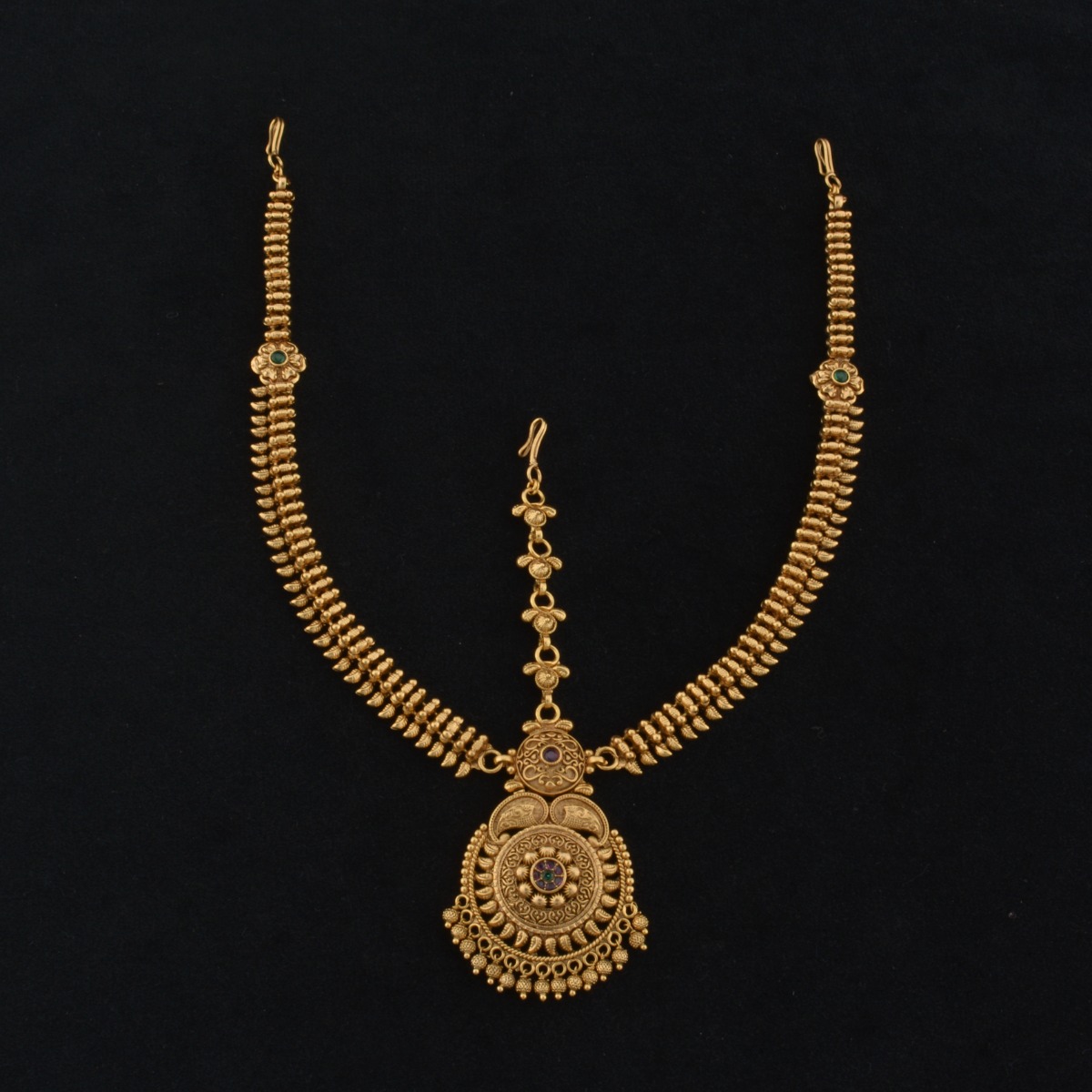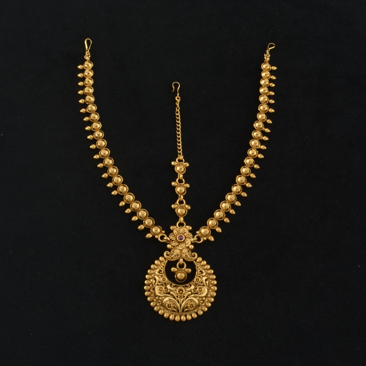 This design on this tayra tikka is not only regal but it is also unique. What makes it so luxurious are the fine quality ruby and green stone embellishments and the antique finish that enhances its charm and look. No lehenga will feel complete without this tayra tikka that will be the talk of the event when you wear it. The detailing and the design of the centrepiece is bound to catch everyone’s attention when you move. The pearl hangings add a contrast to this antique tayra tikka while the centrepiece steals the show.