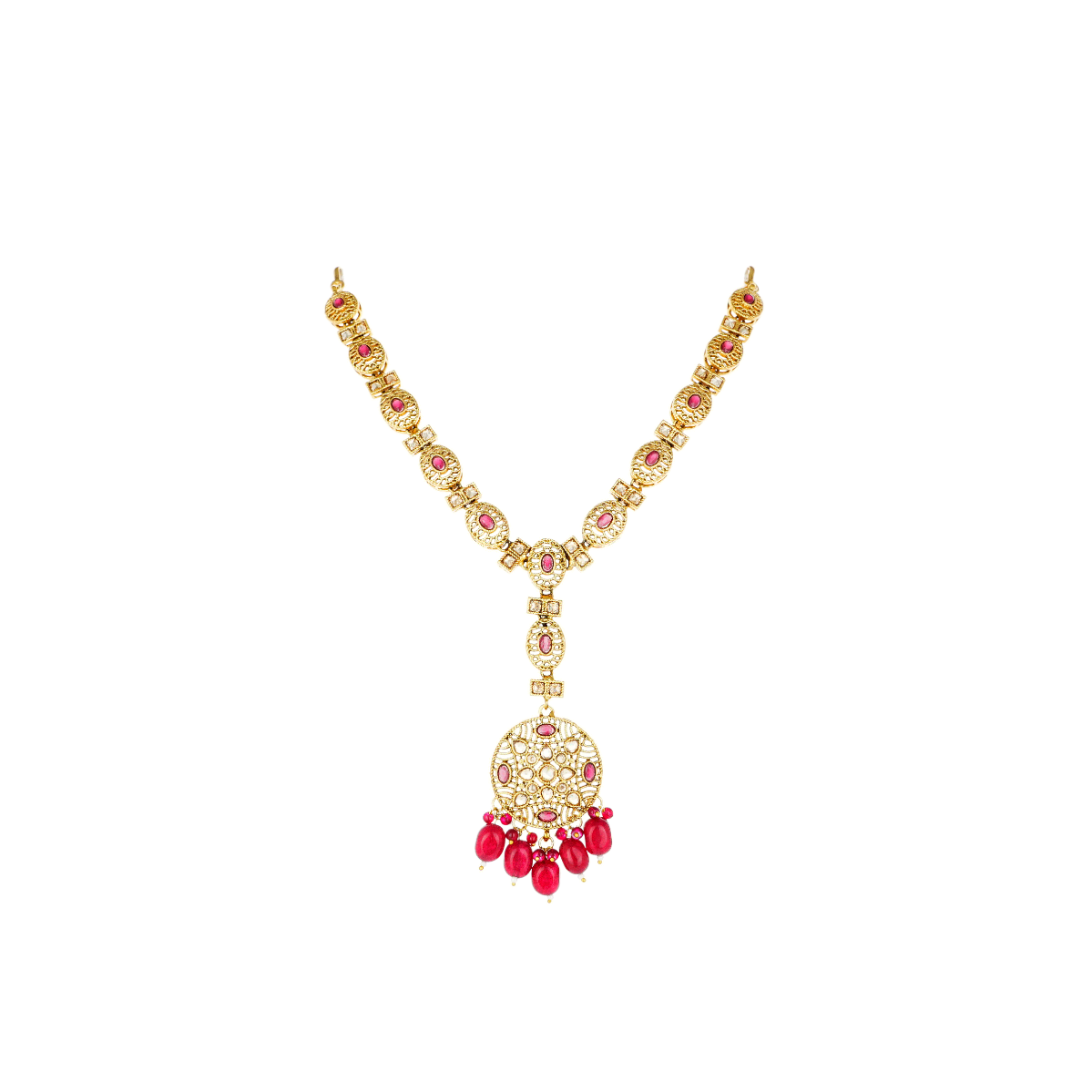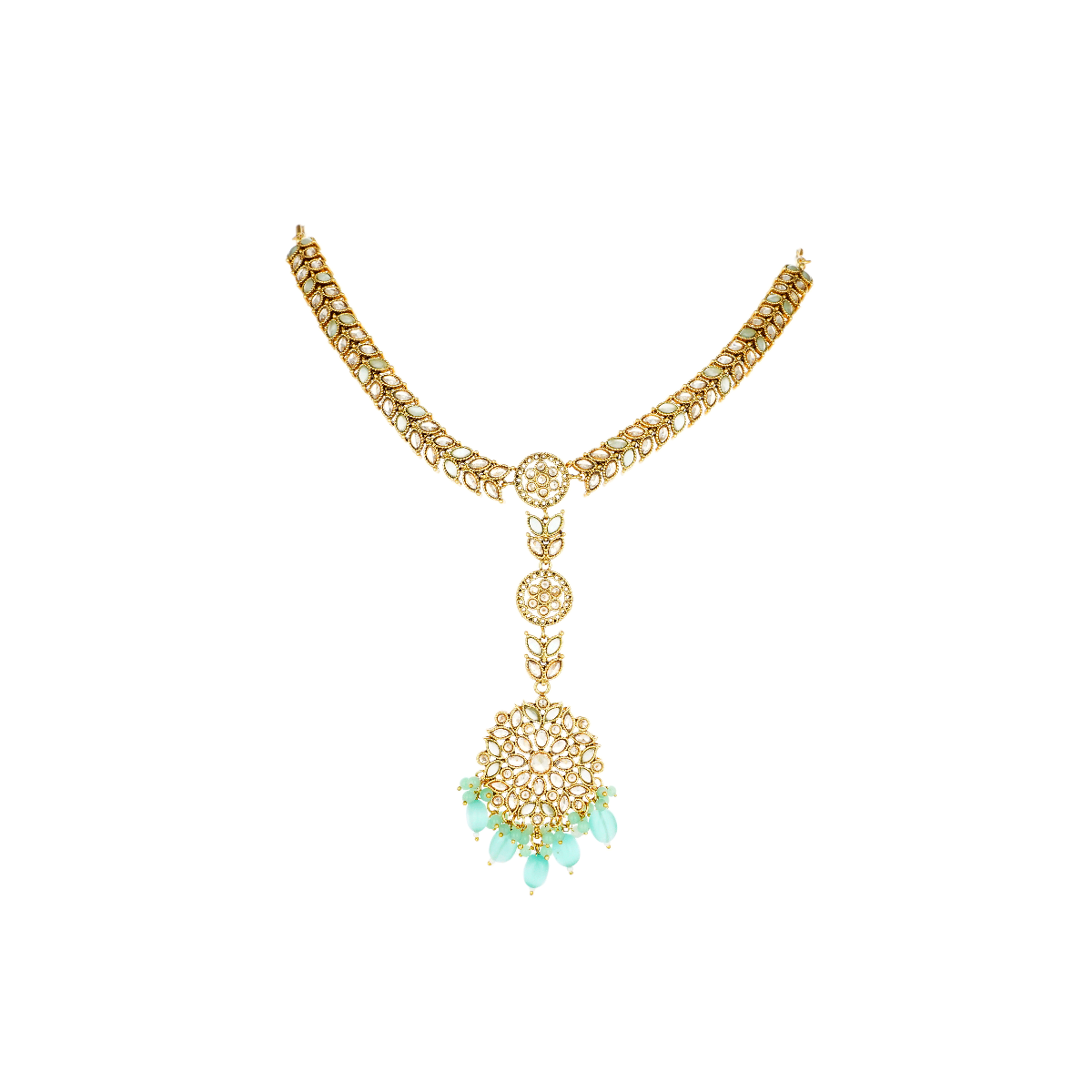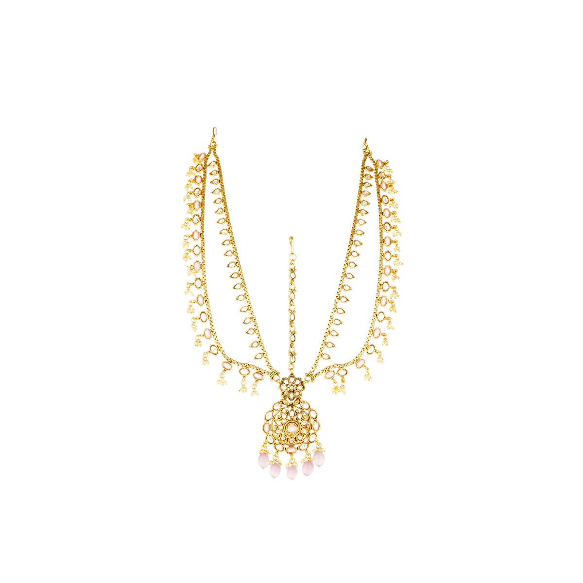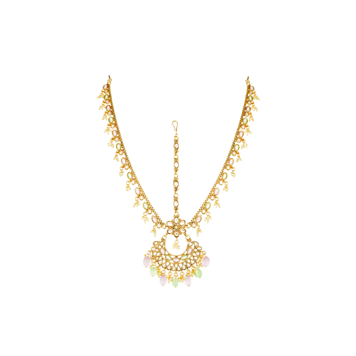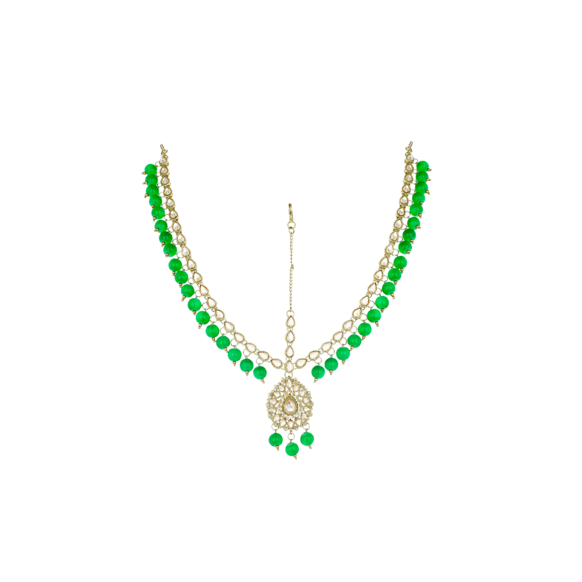 Tyra tikka is the epitome of grace. It is also known as a matha patti and was originally a basic statement jewellery piece adorned by the brides. Now, it has come a long way and are available in different designs as well as patterns. You can get to see some matha patti with elaborate detailing and also some with plain beaded drops feature. This reverse AD and green stone embellished matha patti would elevate your bridal look. Try to pair this tyra tikka with other traditional jewelley pieces picked for weddings. This style of tyrra tikka can go well with a heavily embellished saree.