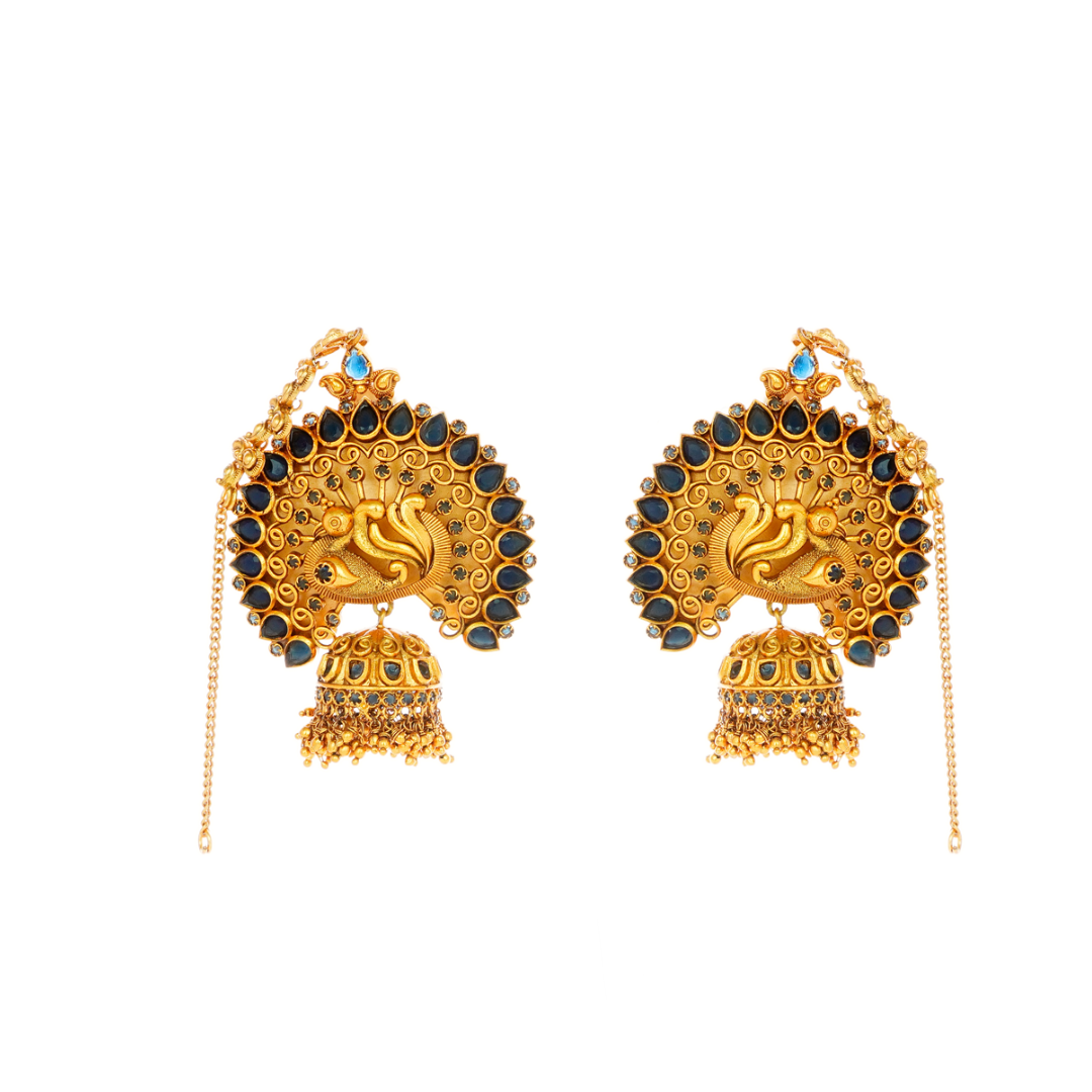 Amp up your traditional look with these pair of peacock design and ruby stone work jhumka earrings. It features similar peacock motifs on the jhumka base. Sport an enticing look with these peacock head and temple dome design jhumka. It makes a perfect festival wear accessory. Team it with a saree of all colour. The earring comes secured with a push back closure. Wipe your earrings with a soft clean cloth after every use. Do store your jewellery in a moisture free box to avoid any kind of scratches. Keep the earrings away from chemical fragrances. This would maintain the shine of the earrings pretty well.