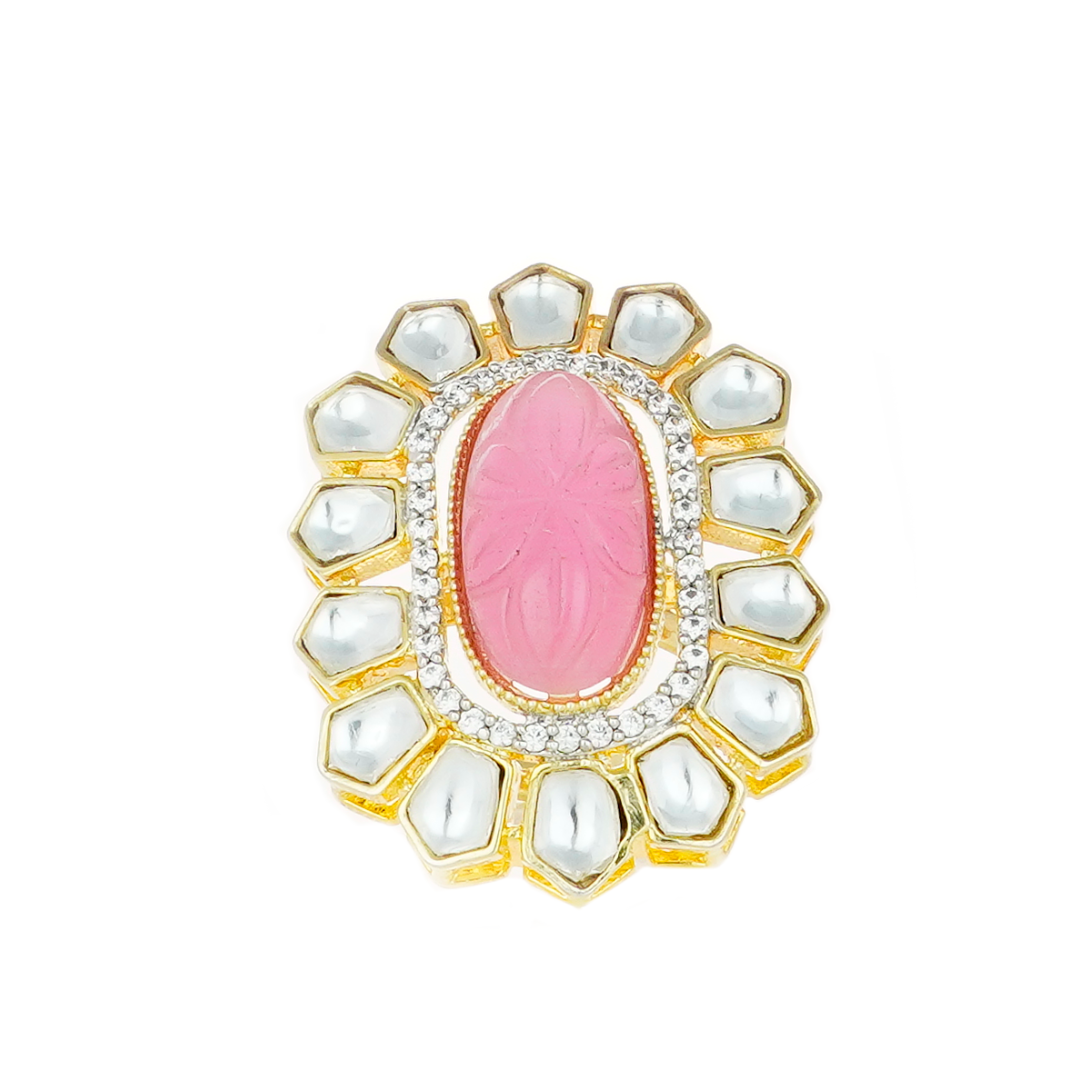 Make a mesmerizing style statement with this splendid finger ring with intricate detailing Shower your loved ones with affection by gifting them this ring studded with gleaming pink and white stones. This eye-catchy ring can be paired with any traditional attire such as a saree. Ideal for women of all age groups. This modern ring can be a great addition to your fusion jewellery box. Perfectly suitable for any special occasion like party or festivals. Remember to keep this ring away from perfumes and sprays. Also, don’t even think of soaking it in water.