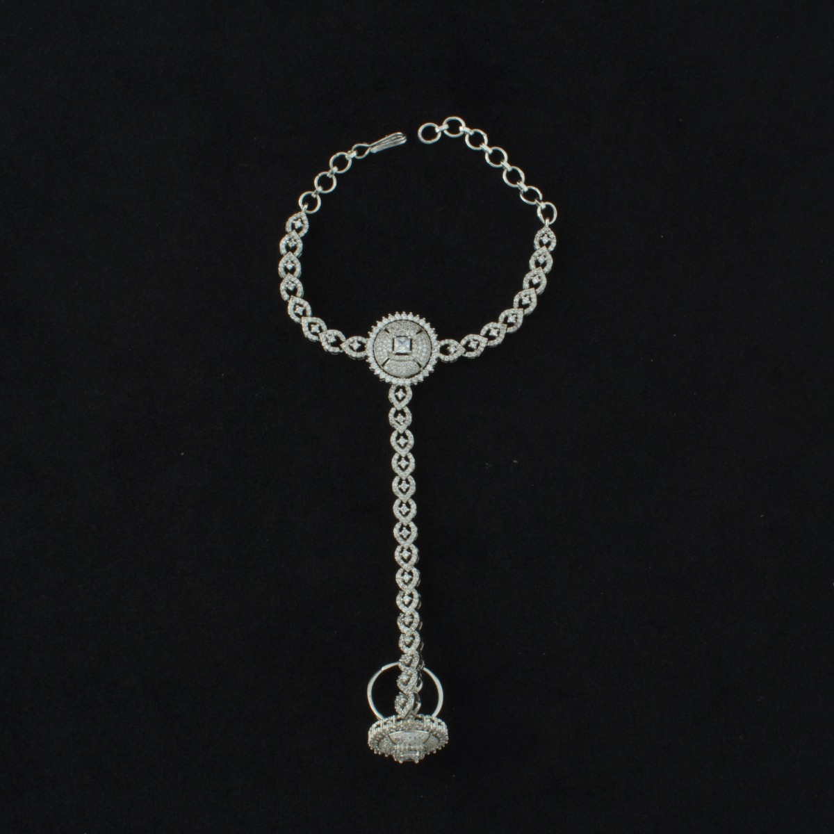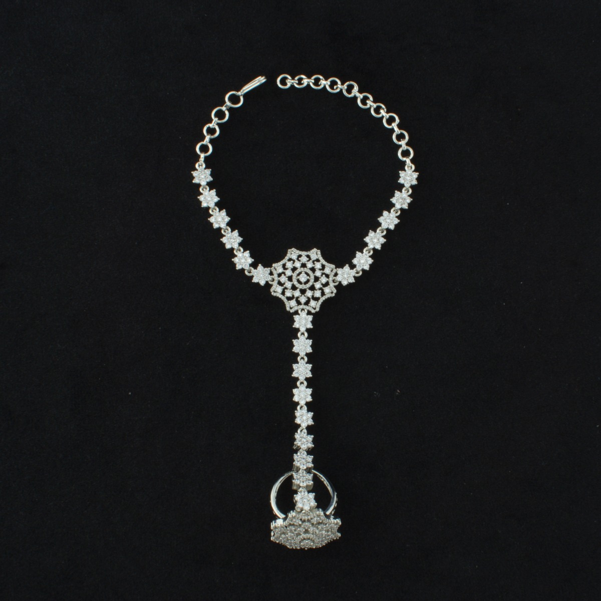 Complete your bridal look with this exquisite CZ American Diamond Hath Phool crafted in an exclusive traditional design. Adorned with sparkling white stones and finished with premium rhodium gold plating, it offers a brilliant shine with lasting durability. Designed to enhance the beauty of your hands, this elegant accessory adds grace and royal charm to weddings and traditional ceremonies. Lightweight and comfortable, it ensures ease of wear throughout long celebrations. Suitable for all regional styles, it pairs beautifully with sarees and lehengas. A timeless statement piece that blends cultural richness with refined sparkle for your most special moments.
