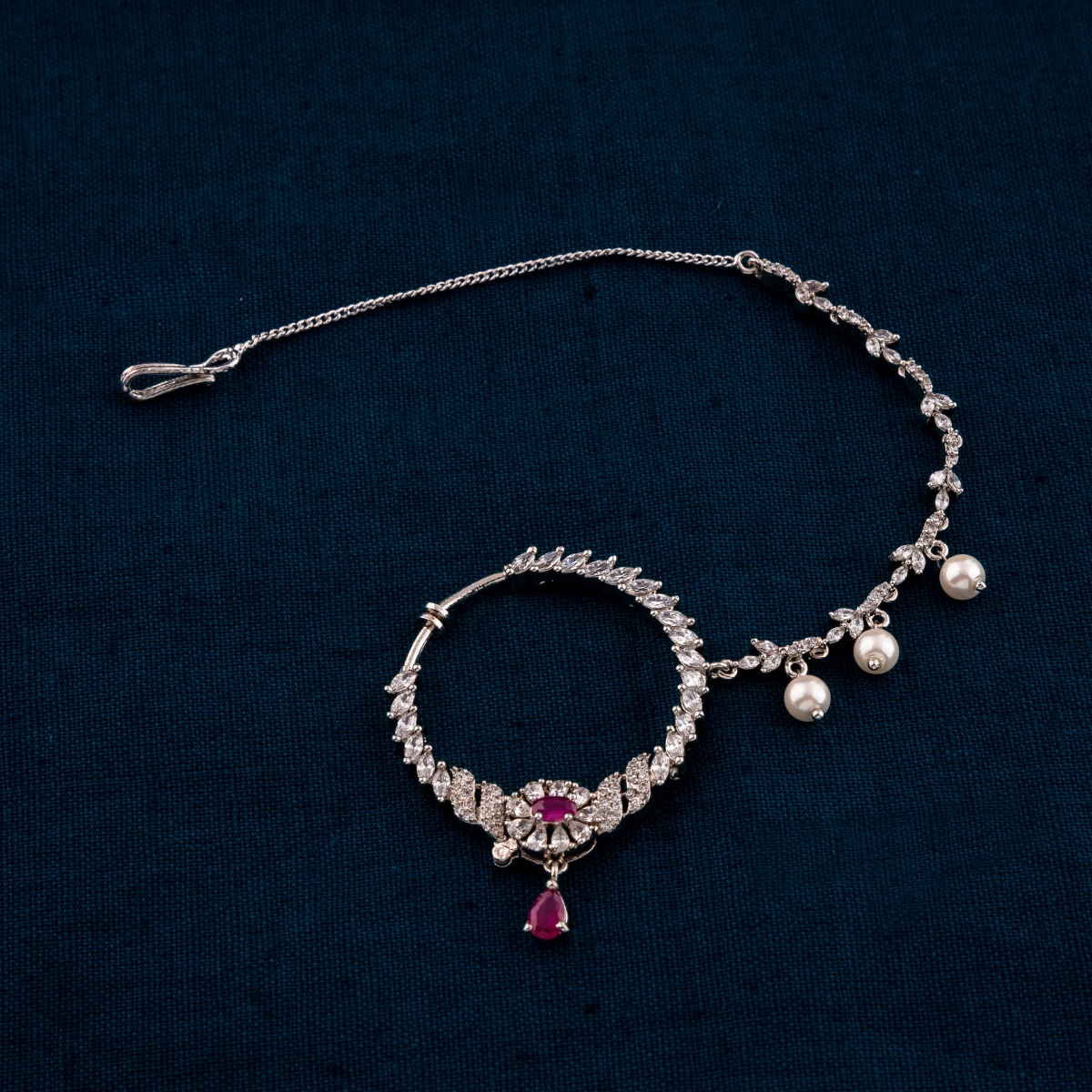 Elevate your bridal ensemble with our exquisite CZ-American Diamond Nath. Perfect for weddings and special occasions, this modern piece features dazzling American diamonds set in elegant rhodium plating. Designed to complement sarees and lehengas, the Nath adds a touch of sophistication and sparkle to your look. Its timeless design ensures it stands out, making it a must-have for your wedding day. Crafted with precision and care, this Nath from our modern collection blends traditional charm with contemporary flair, ensuring you shine with grace and beauty on your special day.