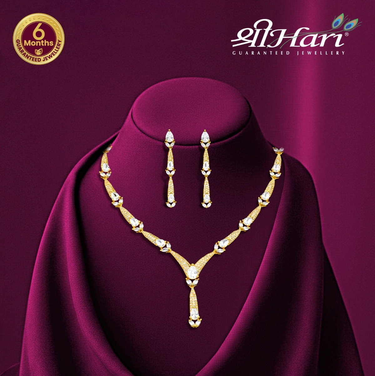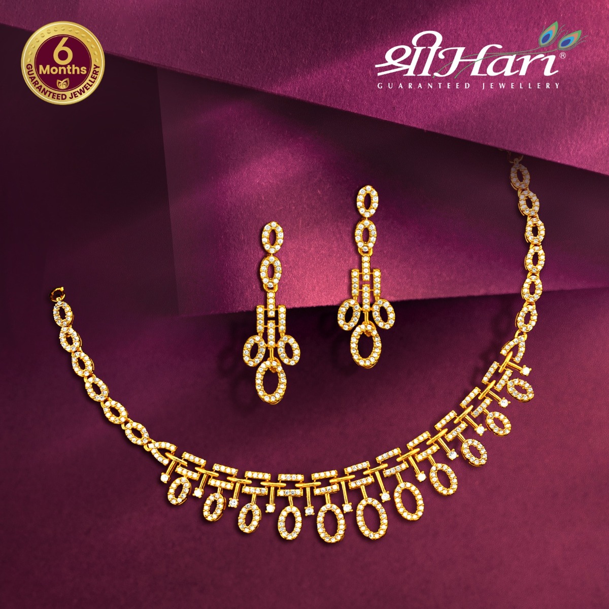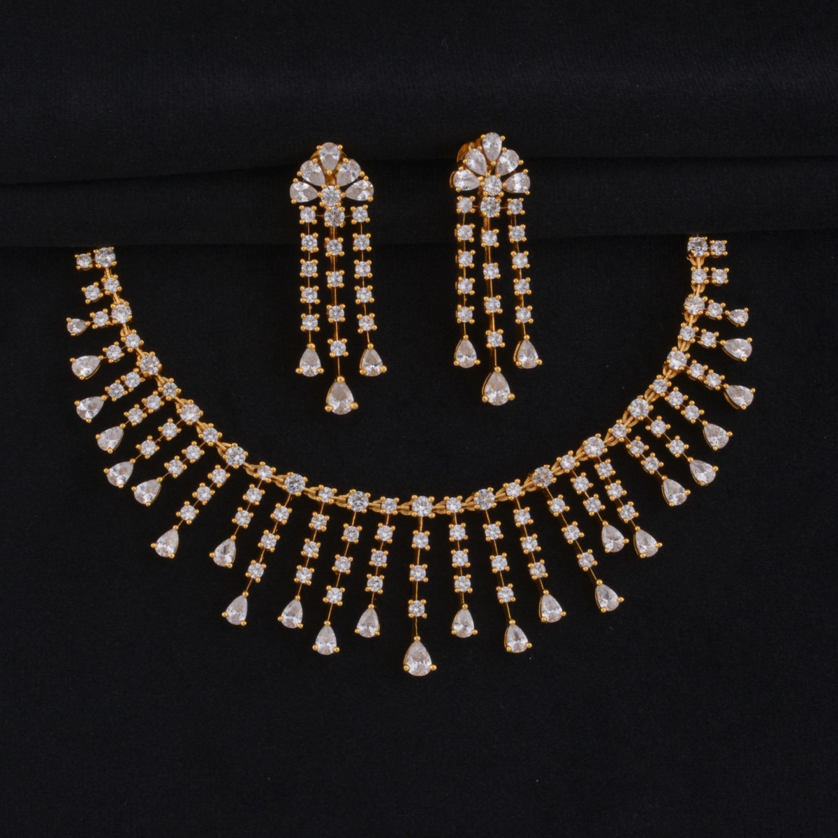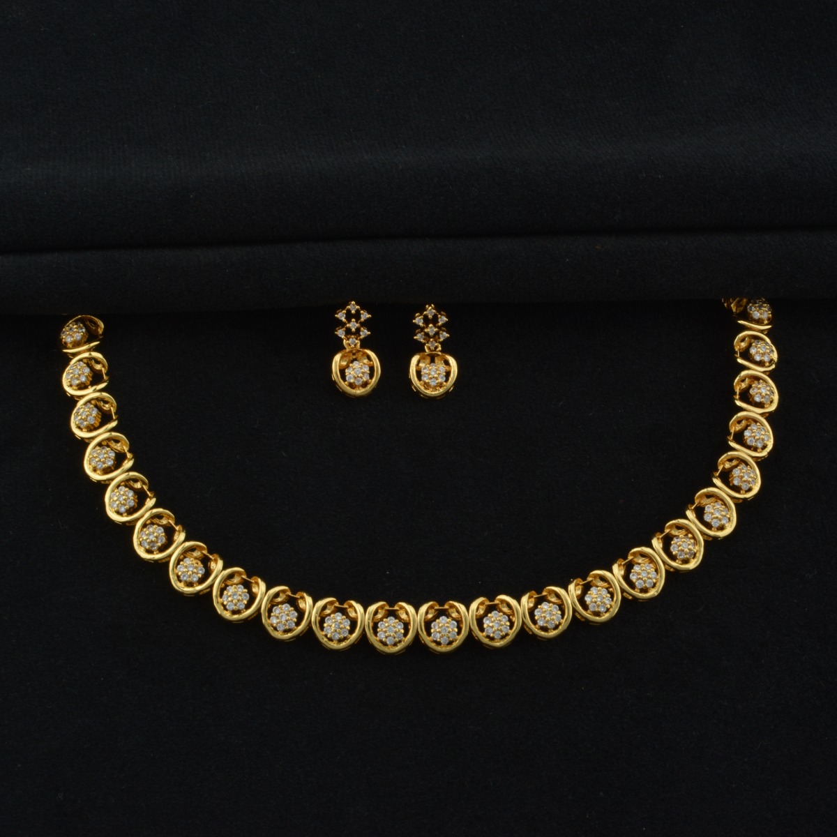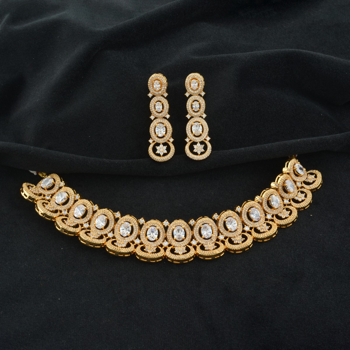 Elevate your bridal and festive look with this stunning gold-plated necklace set, crafted with a guaranteed AD (American Diamond) finish for lasting brilliance. Featuring an exclusive choker-style design, this elegant set adds royal charm and sophistication to your ensemble. Perfect for weddings, bridal functions, and party wear, it beautifully complements traditional outfits like sarees and lehengas. Designed for women who love timeless luxury, the fine detailing and radiant gold plating ensure a graceful, statement-making appearance. Suitable for all regions, this necklace set is an ideal choice to enhance your special occasions with sparkle, elegance, and unforgettable style.