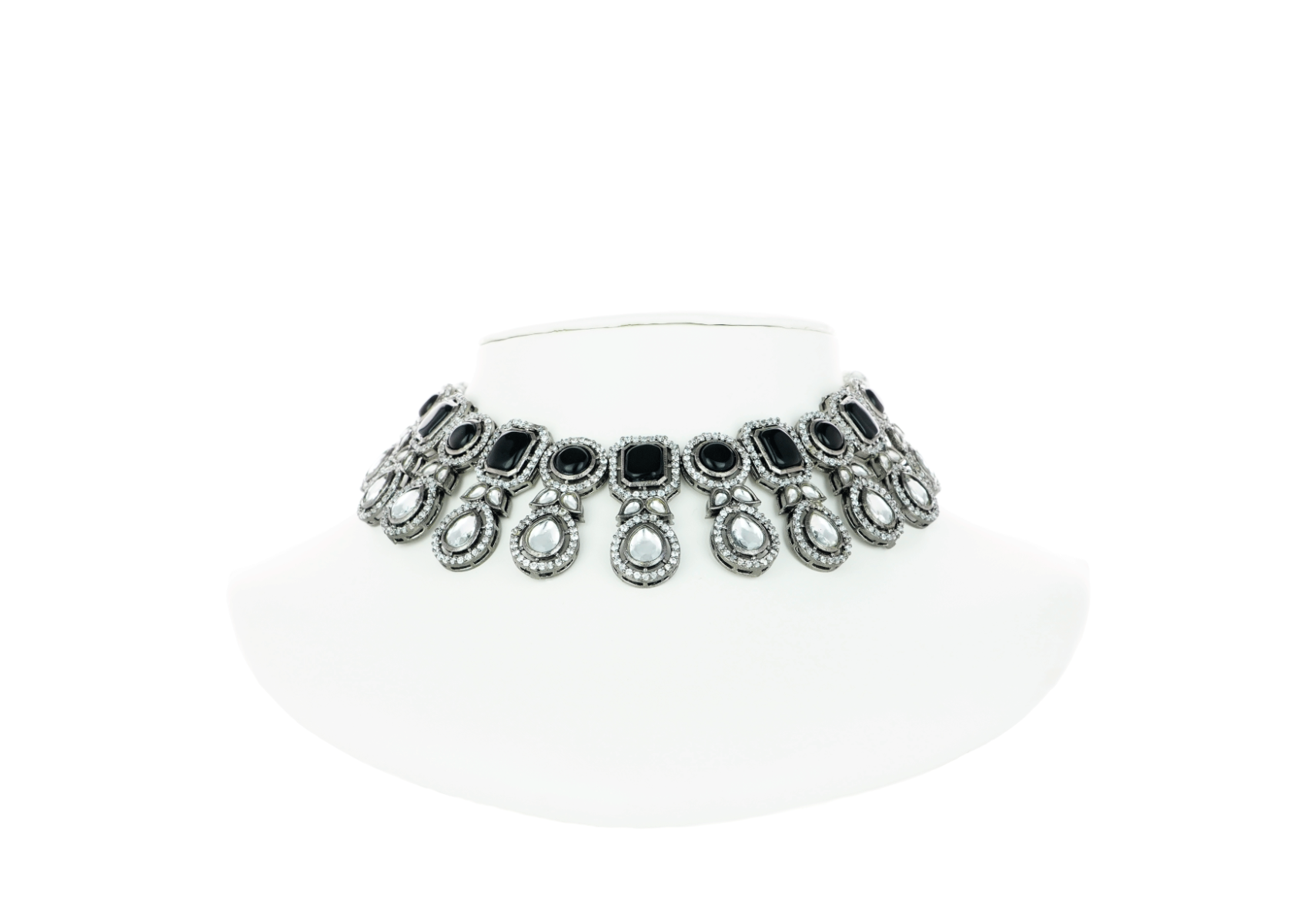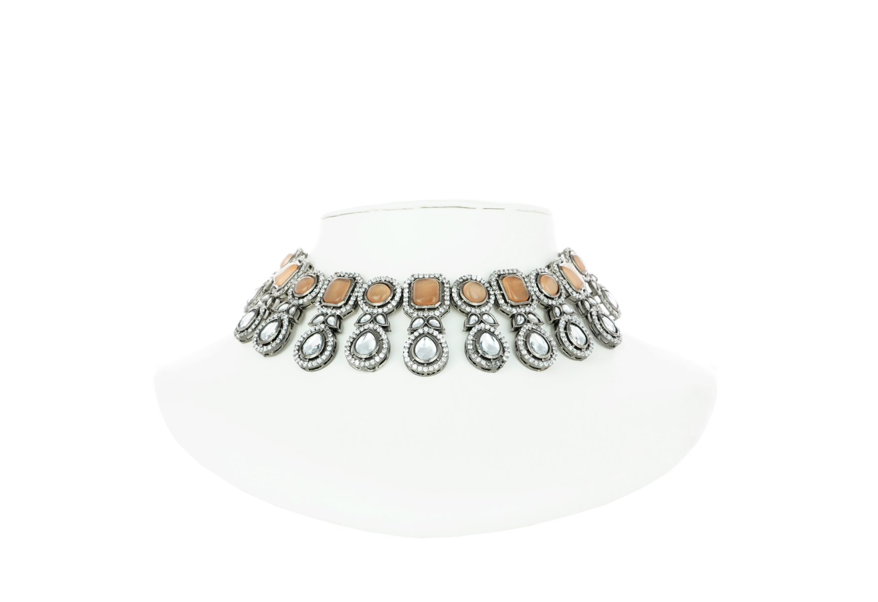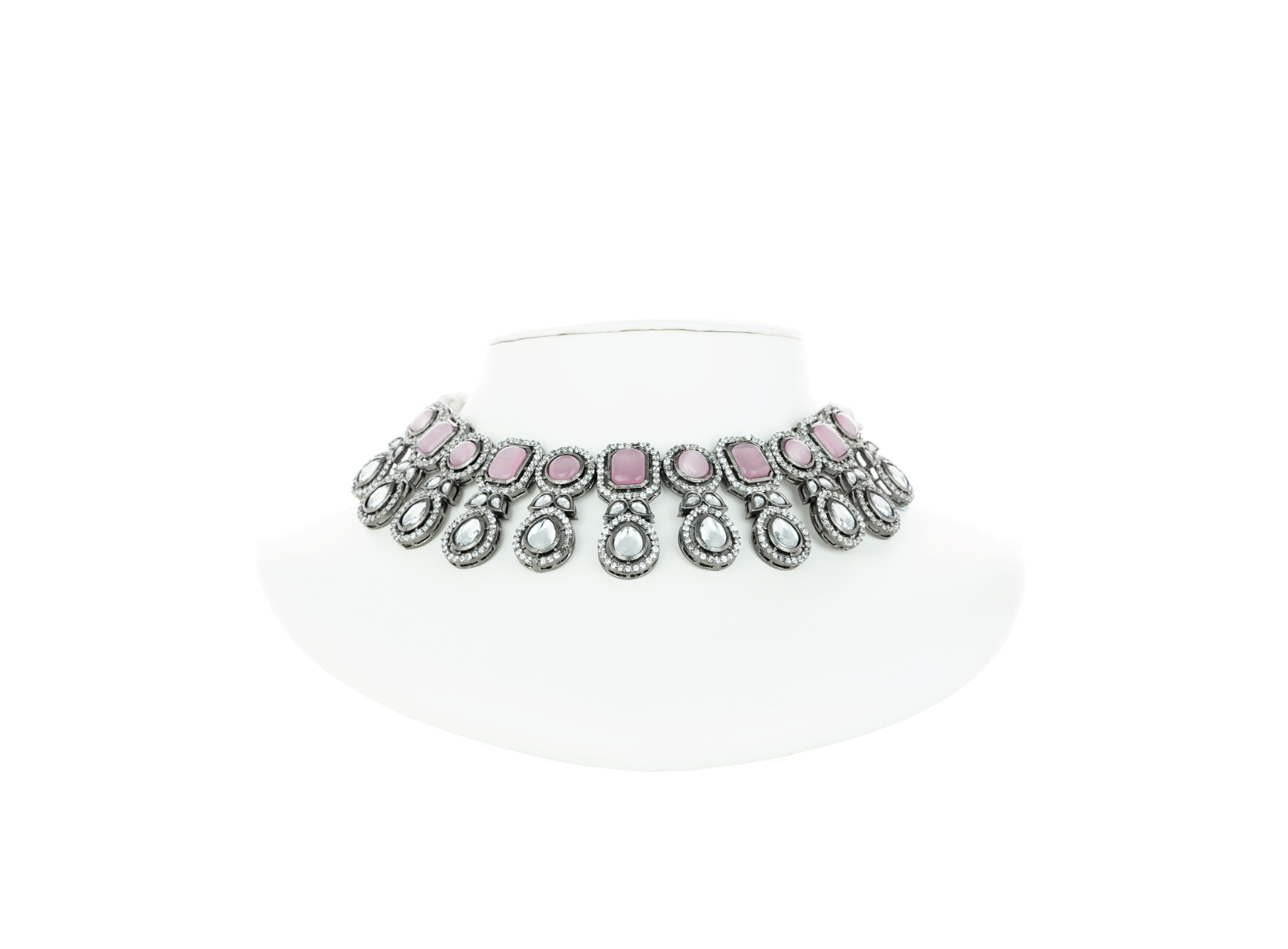 Adorn a beautiful look with this beautiful choker necklace set in a fusion design. It has been beautifully handcrafted with the finest quality stones and pink colour beads. The centrepiece of this necklace comes embellished with Kundan, American Diamonds, and Pink-coloured stone. This modern necklace set is perfect to add to your jewellery collection. Wear this statement piece with any saree. Wear them for special occasions and ace up your ethnic look. You can look stunning as this necklace set offers a simple yet classic look. This beaded necklace comes with matching drop earrings each properly secured with a back closure.