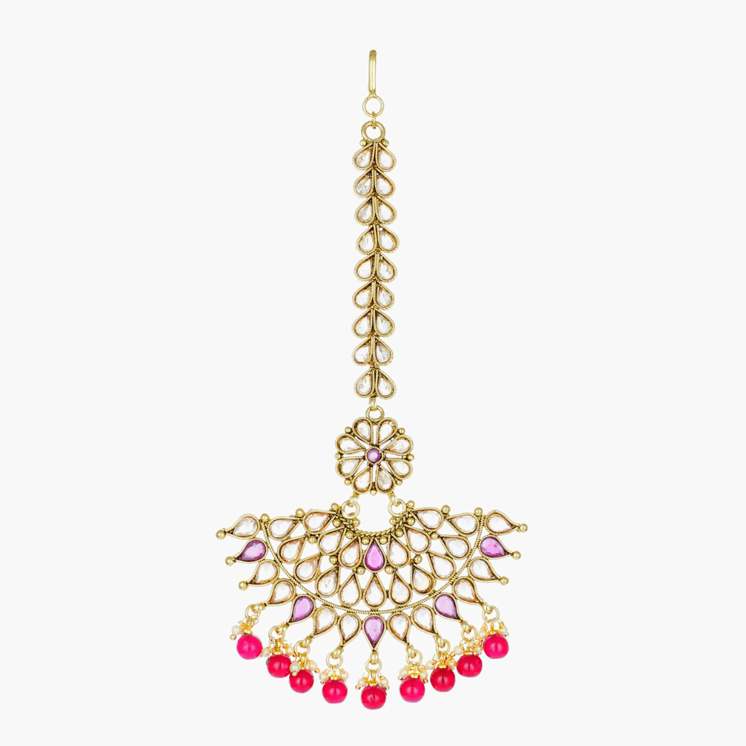 Showcasing a gold-plated beautiful maang tikka embellished with reverse American diamonds and pearl drops in LCT Mehendi colour-plating. This maang tikka has a stunning modern design with intricate detailing. It will match perfectly with all ethnic ensembles like sarees, lehengas, and Anarkali suits. This maang tikka can be paired with all kinds of jewellery sets like golden, Kundan, and more. The yellow finish in this maang tikka adds elegance and charm to its look while the detailed work adds richness to this hair accessory. It must be kept away from fragrances and water to enhance its longevity.