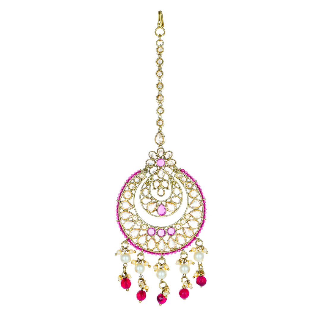 Attractive, gold-plated ruby and reverse American diamond maang tikka for the modern Indian woman. This traditional and beaded maang tikka can be worn for all special occasions. It is the perfect ornament to pair with lehengas as it will add raw beauty to your look. You can match this easily with other jewellery pieces. This maang tikka is light in weight and has an understated charm to it. It will add elegance to your look and can be worn by women of all ages. Store it in a box or cover, to retain its shine.